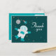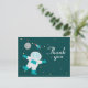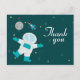 This cute boy's birthday party thank you post card has an out of this world space theme! The background has a dark teal colour with lots of yellow, white, and grey stars in the background. There is an astronaut on the left with a grey moon with a star flag at the top. There is a rocket ship floating to the right of the moon. On the right, Thank you is written. On the backside, there is a space for you to hand write in your thank you message at home.