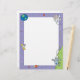 This cute letterhead features a blue border with planets, the Earth, satellites, and an astronaut tethered to a lunar module on the moon.