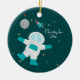 This cute boy's personalised round ceramic photo ornament has an out of this world space theme! The background has a dark teal colour with lots of yellow, white, and grey stars in the background. There is an astronaut on the bottom with a grey moon with a star flag at the top. There is a rocket ship floating to the right of the moon. On the right, you can easily customise the name and the year. On the backside, you can easily add your own photograph.