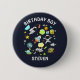 Birthday button with a cute and colourful pattern with all kinds of outer space themed elements. Images include astronauts floating around in their white space suits. Stars and planets and cool little rocket ships, spaceships, and satellites. Fun and crazy design.