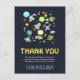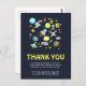 Party thank you postcard with a cute and colourful pattern with all kinds of outer space themed elements. Images include astronauts floating around in their white space suits. Stars and planets and cool little rocket ships, spaceships, and satellites. Fun and crazy design.