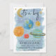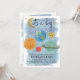 Cute space invitation with planets, moon and stars accented by faux gold elements.