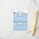Outer space diaper raffles, two per sheet, with blue stars on background. Each card is light blue with a spaceman, spacecraft and pale yellow moon. Cut out and enclose in the envelope with matching invitations.