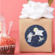 Yellow moon, cute spaceman holding an "It's a Boy!" flag and spacecraft on a midnight blue background with floating blue stars.
