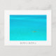 Postcard of a man paddling in an outrigger canoe boat in the bright blue lagoon of the tropical Island Bora Bora near Tahiti in the Pacific archipelago French Polynesia with a white border and the text: 'Bora Bora'.
