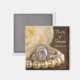 Customise the elegant Oval Diamond Ring and White Rose Wedding Square Magnet with the personal names of the bride and groom and specific marriage ceremony date to create a personalised keepsake wedding gift, party favour or save the date. These classy custom nuptial magnets feature a close up floral photograph of an oval diamond engagement ring, white pearl necklace and white rose flower blossom on a brown silk background.