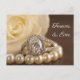 Announce your upcoming nuptials with the elegant Oval Diamond Ring and White Rose Wedding Save the Date Announcement Postcard. This classy custom marriage keep the date card features a close up photograph of an oval diamond engagement ring, white pearl necklace and white rose flower blossom on a brown silk background.