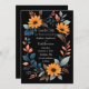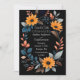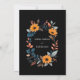 This wedding card design features an elegant, oval floral frame centred on a deep black background. The frame is composed of vibrant orange sunflowers, complemented by an array of blue, grey, and peach-coloured leaves and sprigs, creating a harmonious blend of warm and cool tones. The arrangement of flowers and foliage forms a natural border around the card, making it perfect for showcasing the wedding details in the centre. The design combines modern sophistication with a touch of rustic charm, making it an ideal choice for a wedding that embraces both elegance and the beauty of nature. Personalise the card with your names and details of the wedding. You can download the card to your mobile device or computer. Card was created with the help of ai.