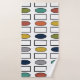 This towel set has a bath towel with a mid-century modern design of repeating rectangles and ovals in retro colours, a turquoise washcloth, and a yellow hand towel.