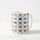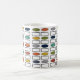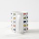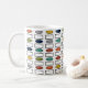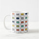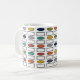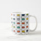 This mug has a mid-century modern design of repeating rectangles and ovals in retro colors.