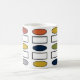 This mug has a mid-century modern design of repeating rectangles and ovals in retro colors.