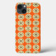 This phone case has a mid-century modern design of cream ovals and black starbursts on a field of orange.