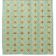 This shower curtain has a mid-century modern design of cream ovals and black starbursts on a field of sea green.