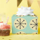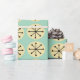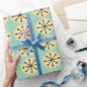 This wrapping paper has a mid-century modern design of cream ovals and black starbursts on a field of sea green.