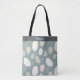 Cream, moss green, pinkish orange, and greenish tan ovals, roughly drawn and painted, interspersed with white twigs and leaves on a dark mint green background make a striking, modern, casual tote bag.