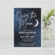 Over the moon baby shower party invitations in navy blue, white, and silver colours. Baby shower for a mother expecting a baby boy or girl. Celestial-themed party supplies with a moon and stars on a galaxy background.