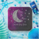 Over the moon baby shower with silver moon and stars against a black and pink purple night sky background