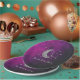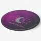 Over the moon baby shower with silver moon and stars against a black and pink purple night sky background