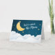 A crescent moon is tied up with string against a night sky above fluffy white clouds. Golden stars pepper the background of the cobalt night sky to thank guests for an over the moon baby shower. Unisex and versatile for any baby celebration whether it is a baby shower, baby sprinkle, or sip and see. Available with matching products.
