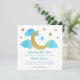 Invite guests to a magical celebration with this “Over the Moon” baby shower invitation in dreamy blue and glittering gold. Featuring watercolor clouds, golden stars, and a sparkling crescent moon, this design is ideal for honouring a baby boy. Personalise with your shower details to create a custom card that’s perfect for celestial, moon-and-stars, or blue and gold baby shower themes.