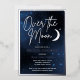 Over the moon bridal shower party invitations in navy blue with real silver foil. Celestial-themed party supplies with a moon and stars on a galaxy background to celebrate the soon-to-be bride and Mrs.