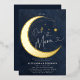A sweet Over the Moon coed baby boy shower invitation featuring a watercolor illustration of a crescent moon mobile over a deep navy blue watercolor background, with gold foil on the moon and the moon mobile. Perfect for future parents who love the over the moon theme, the moon and the stars and celestial themes.