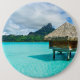 Button with an over-water thatched roof honeymoon bungalow in a resort in the clear turquoise lagoon of the tropical island Bora Bora with view on Mt. Otemanu near Tahiti in French Polynesia.