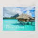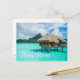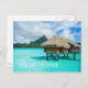 Postcard of an over-water thatched roof honeymoon bungalow in a resort in the clear turquoise lagoon of the tropical island Bora Bora with view on Mt. Otemanu near Tahiti in French Polynesia with the text: 'Bora Bora'.