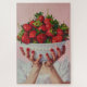 A striking hyperrealistic painting of a bowl overflowing with fresh, glistening strawberries, held by delicate hands with vibrant red nails. The soft pink background and white ruffled sleeves create a harmonious contrast, enhancing the luscious red hues of the fruit. This artwork captures the essence of indulgence and beauty in a visually stunning composition.