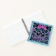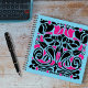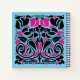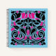 Square, blue notebook with two-color art nouveau style illustration on the front which is named "overgrowth". Black and bright pink colors create a swirling array of vines, leaves, hearts, bugs and flowers. A lively nature image, which is a unique design that fits the 8.5 inch square notebook perfectly! The pattern continues to the back of the book, and this size notebook has page style selections. Use as a drawing / sketchbook, or as a personal journal. A versatile little book with an artistic design that stands out.