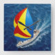 A sailboat cuts through the vibrant blue ocean, powered by a brightly coloured spinnaker featuring red, yellow, and blue sections