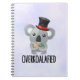A psiral notebook with a funny and humourous design with an illustration of a cute koala wearing a black top hat with the typography text below which says overkoalafied.