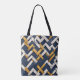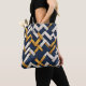 Overlapping geometric shapes in navy blue, white, and mustard yellow, creating a repeating diagonal pattern tote bag