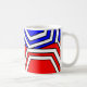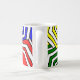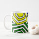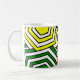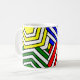 This mug has a Bauhaus design of overlapping concentric hexagons in red, yellow, blue, and green.
