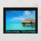 Postcard with a honeymoon overwater bungalow in a luxury resort in the clear blue lagoon of the pacific island of Bora Bora, near Tahiti in the French Polynesia archipelago.
