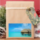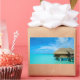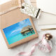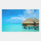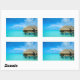 Rectangular souvenir photo sticker of a honeymoon overwater bungalow in a luxury resort in the clear blue lagoon of the pacific island of Bora Bora, near Tahiti in the French Polynesia archipelago.