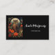 A business card with a cool looking owl with a piercing stare. A full moon in the back with a garden of red flowers.