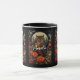A mug with a cool looking owl with a piercing stare. A full moon in the back with a garden of red flowers.