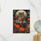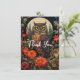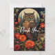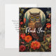 Thank you card with a cool looking owl with a piercing stare. A full moon in the back with a garden of red flowers.