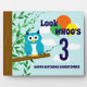 Look whoo's having a birthday! Fun blue owl in a woodland scene with blue sky and fluffy clouds