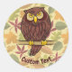 Cartoon illustration of owl sitting on tree branch. Custom text.