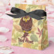 Cartoon illustration of owl sitting on tree branch. Custom text on both sides.