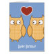 Perfect for kids - design of two owls standing together with a red love heart between them on a sky blue background. Cute and quirky cartoon design inspired by love and friendship.