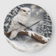 A magnificent owl rests on a snow-covered branch, surrounded by a serene winter landscape. Snowflakes gently fall amidst frosty trees, creating a captivating scene of tranquillity and beauty in this enchanting, wintry environment.