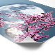 A painting of a Barn Owl perched on the flowering tree branch of a fruit tree, with a Full Moon in the background.