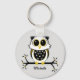 Basic Button Keychain with a gold, black and white owl on a limb with leaves and berries.
