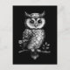 A black and white picture of a beautiful owl sitting on a branch, between flowers and leaves.