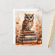 Postcard features studious bird watercolor artwork of a cute owl perched on a stack of books in the fall season, surrounded by autumn decor including a pumpkin. Warm colour scheme includes oranges, browns, and neutrals. Great for owl lovers and bibliophiles! Maybe you're just a girl or guy who loves owls and books. And the autumn aesthetic! This cosy avian artwork is for you.