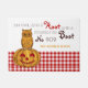 Owl on Pumpkin Gingham Pattern Door Mat. This door mat features an owl perched on top of a smiling Halloween pumpkin. The words "An Owl and a Hoot and a Pumpkin to Boot". Along with your door number and family name. The background has a neat Gingham pattern which compliments the barn style design.
