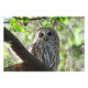 Closeup photo of a great horned owl sitting on a branch in the forest with red berries over his head.